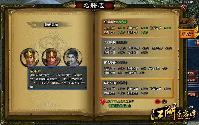 江湖豪客傳》中每名武將的加成屬性,以及武將人物生平小傳,收集到各種武將可額外加乘玩家自身屬性,就算招募的武將並未被使用在陣法上,玩家屬性也會有所提升!另外,收集指定的武將組合還可開啟特殊加成,使玩家戰力倍增!