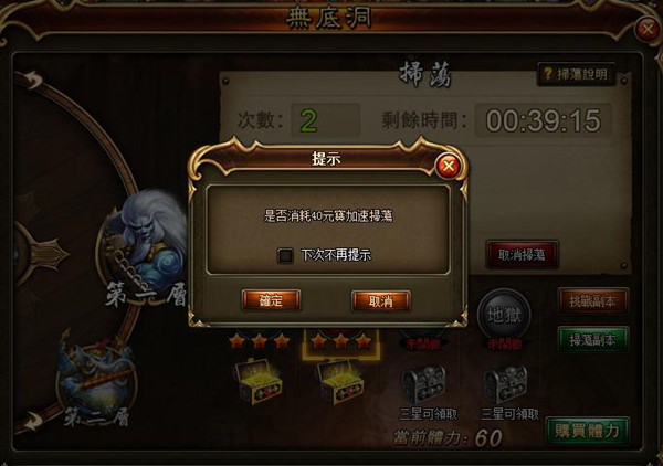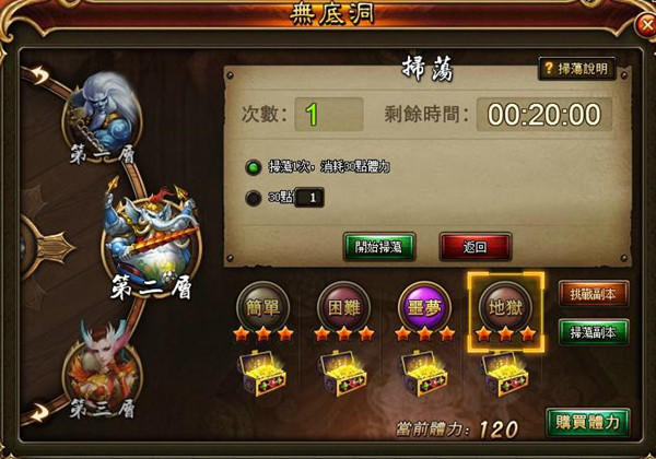 鬥戰聖佛》無底洞還為玩家開劈了一條便捷通道,玩家等級達到 34 級後,即開啟掃蕩功能,可以對已通關副本進行掃蕩,不用自己動手即可把敵人消滅殆盡,同時又可獲得豐厚的獎勵。當然,天下沒有免費的午餐,每一次掃蕩需要消耗 30 點體力和一定的時間。想要儘快修成正果而又不想錯失可獲得經驗和銀兩的機會的玩家,可以使用元寶加速立即完成掃蕩,升級到一定的 VIP 後,玩家同樣可以享受免除 CD 時間的優厚待遇,考驗是否願意為愛付出的時刻到啦!
