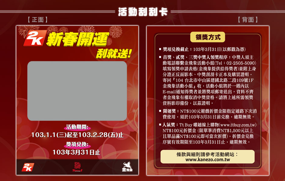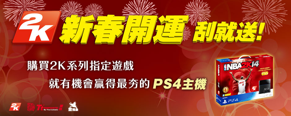 2K 今(27)日宣布將舉辦「新春開運刮就送!」賀年促銷活動,自民國 103 年 1 月 1 日起至 103 年 2 月 28 日止,於全省指定通路購買 2K 系列 7 款指定遊戲 *Xbox 360 或 PS3 版本,遊戲盒外包裝即附有活動刮刮卡一張。張張有獎,通通有禮,現買現刮有機會贏得 PS4 遊戲主機、PS Vita、經典遊戲、NT$100 元折價金等多重獎品。