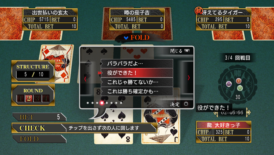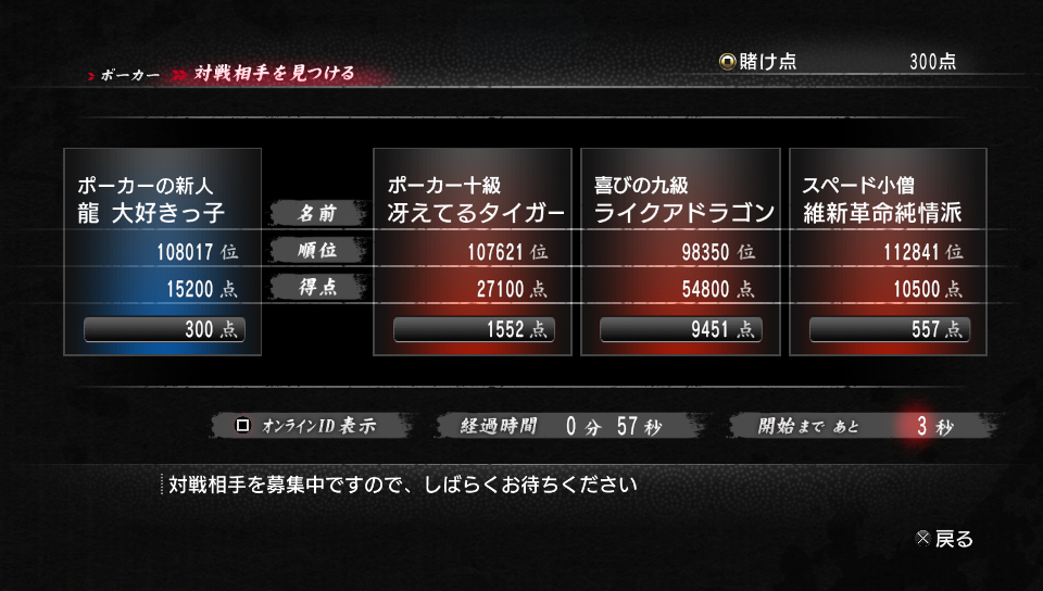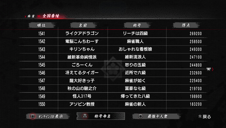 賭場迷你遊戲的網路對戰結果都會反映在名為「全國番付」的排行榜上。玩家也可在系統準備好的稱號群中來製作原創的稱號