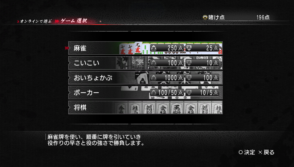 可以進行網路對戰的迷你遊戲有麻將 / 將棋 / 來來(こいこい:日本花牌玩法之一) / 八九牌(おいちょかぶ:日本花牌玩法之一 / 樸克牌 5 種。