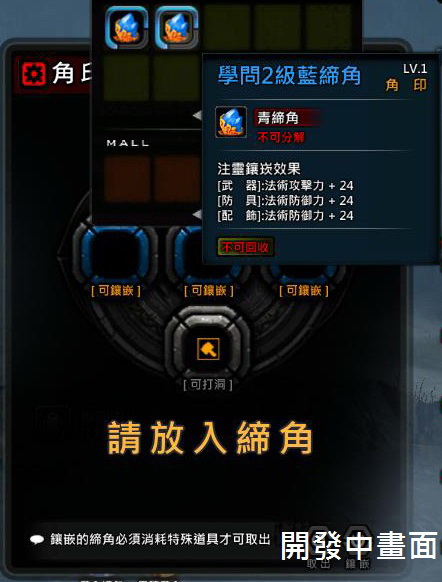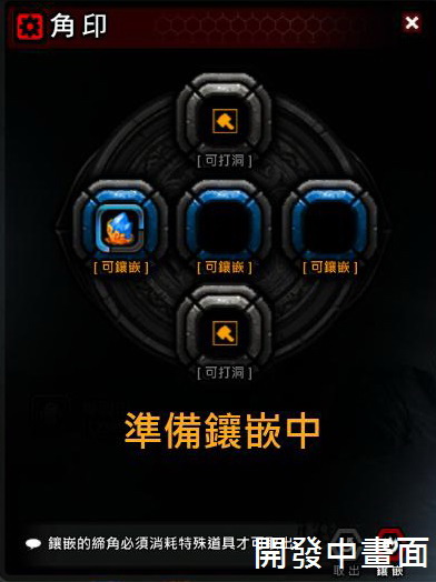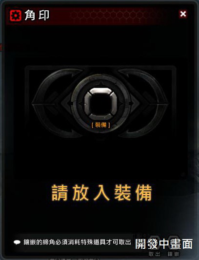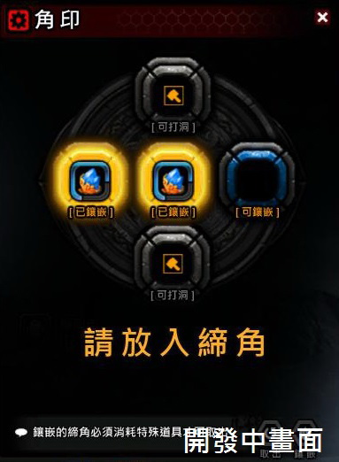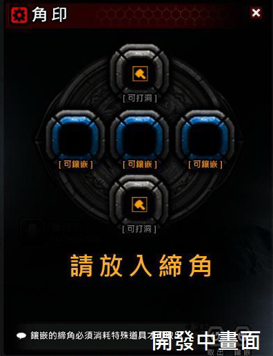 角印是「締角」與「驅印」的統稱,締角可以鑲在裝備上,同一件裝備中的締角組合可以組合出驅印效果。締角分為 10 個等級,等級愈高強度愈強,並依六象之氣可以分為六種顏色締角,透過蒐集各式角原礦可以煉化出各色締角,角原礦則可在在租界及副本中蒐集到。煉化好的締角則可鑲嵌在武器、防具或飾品上,武器有 5 孔可以鑲嵌締角,防具跟飾品則各有 3 孔及 1 孔,鑲嵌單顆即有效果,玩家需以現在的裝備去找出最好的角印組合。黃正宇指出,這主要是以六向八屬變化來設計,像玩家選了白、金、赤之後,就會出現紅色象限、擁有紅屬性能力,玩家未來可以討論與嘗試如何組成屬性,而角印又有屬性相剋,將可使變化性增加、讓玩家所擁有的武器變得更加獨特。