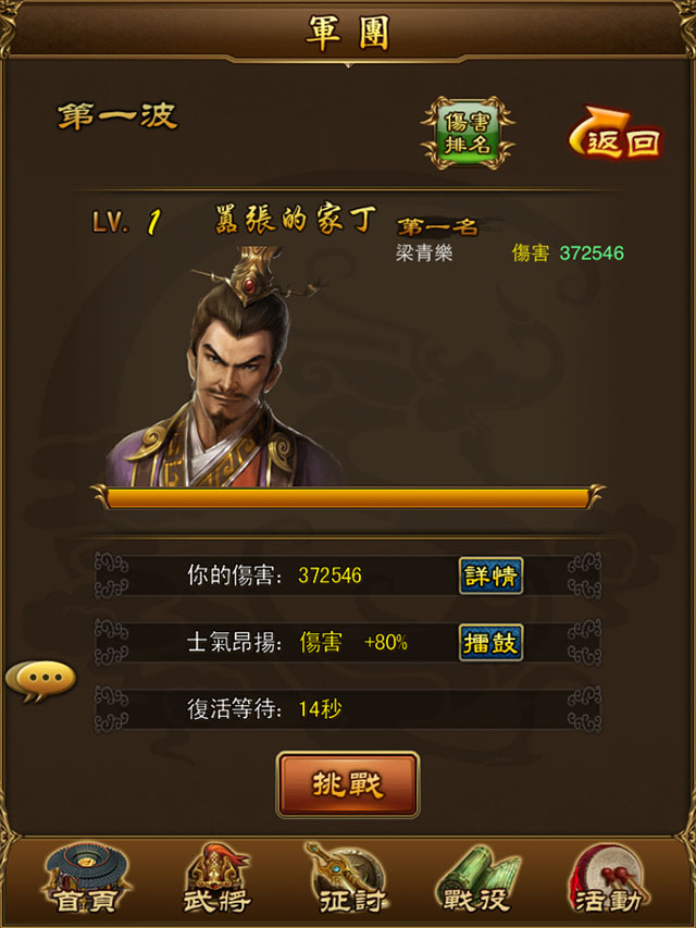 軍團BOSS戰終於開打!新版本中,玩家只要達到55級並成功加入軍團,就可以在每天的晚上21:00-21:20參與軍團戰鬥。主君可以和自己團隊的戰友一起協同作戰,擊殺BOSS獲得軍團軍力獎勵,個人還可以根據傷害排名獲得風火林山寶箱和精氣獎勵喔。