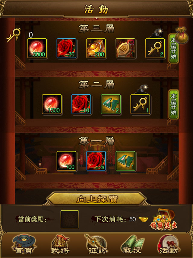 新版本中還將不定時開啟活動「瓊樓探寶」,玩家不分等級,只要花費50元寶後即可進入瓊樓探寶,從第一層開始,每進入一層將會隨機獲得該層的一個獎勵,每層都可以選擇領取獎勵退出,或放棄本層獎勵繼續進入更高的層樓喔!從第二層開始,玩家就有機率獲得鑰匙,集滿一定的鑰匙數量可以直接跳層攀升。越往上攀升,獎勵內容也將更加豐富。
