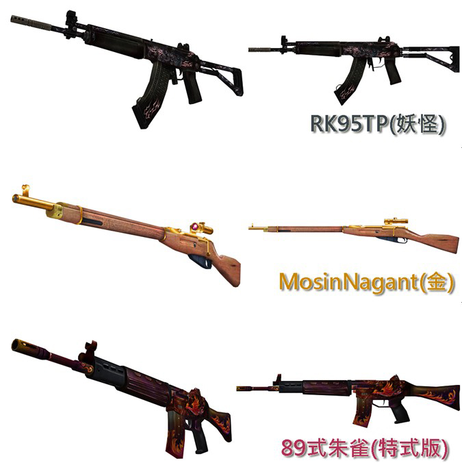 配合本次妖怪祭改版,推出了三款全新槍枝,玩家可在 CASH 拉霸中獲得以妖怪主題推出的花色槍枝「RK95TP(妖怪)」以及擁有百年歷史、一直為世人所津津樂道的「MosinNagant(金)」步槍。第三把男人武器庫中必備的新槍「89 式小槍(朱雀)特式版」,則為本週轉蛋機的大獎,可透過轉蛋機取得。