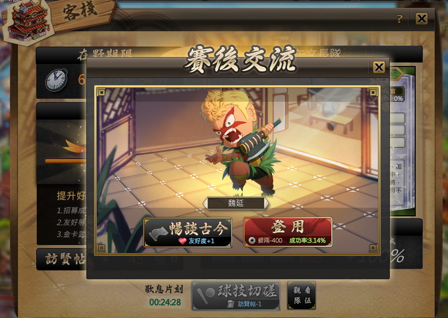 在《激鬥棒球魂》中,客棧是得到強力武將的途徑之一,玩家可選擇適合自己的難度向當週武將挑戰,勝利後即可增加友好度,並且有機會登用該武將哦!本周維護過後,官方推出「客棧招募武將銀兩8折優惠」活動,讓所有玩家都能以更便宜的價格招募武將魏延喔!