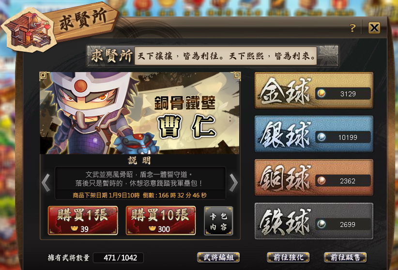 為歡送2013、迎接2014,官方特地準備了最超值的活動! 本週「銅骨鐵壁曹仁包」十抽原價390元寶,現在只要300元寶,讓玩家開心迎新年!想得到超強力捕手曹仁嗎?快整頓隊伍,換上專業捕手曹仁吧!