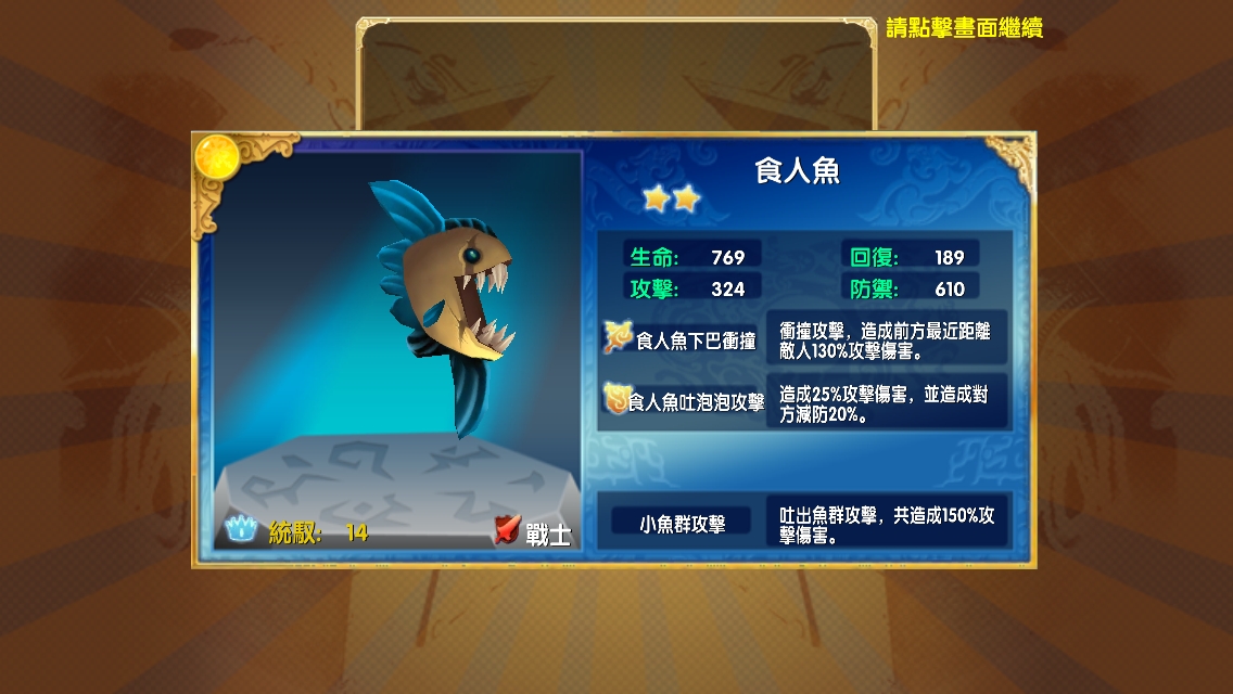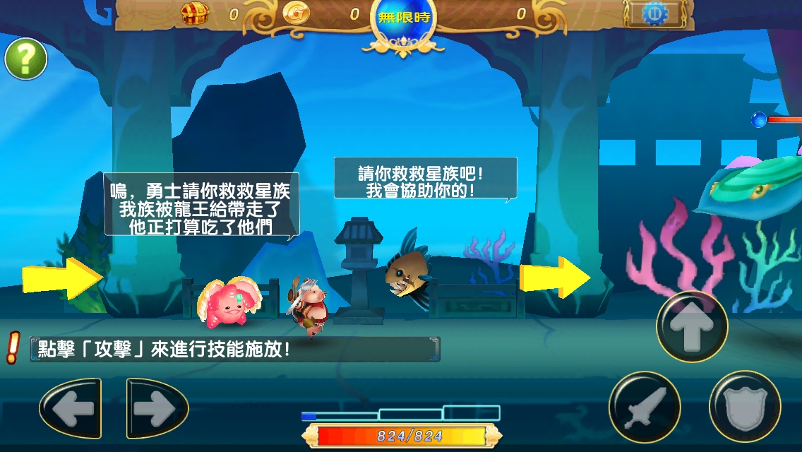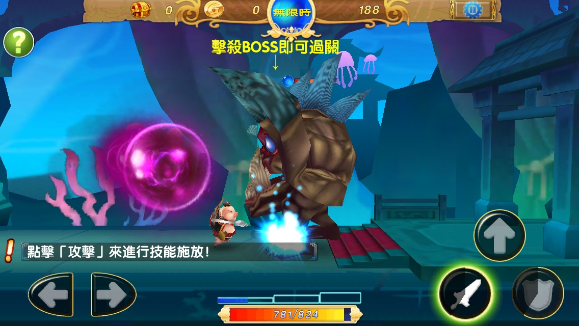 打敗大魟魚,就會遇到新手關卡的第一個 BOSS。BOSS 看起來很可怕,不過跟大魟魚一樣,只是需有其表的傢伙!只要使用攻擊,就可以順利過關。
