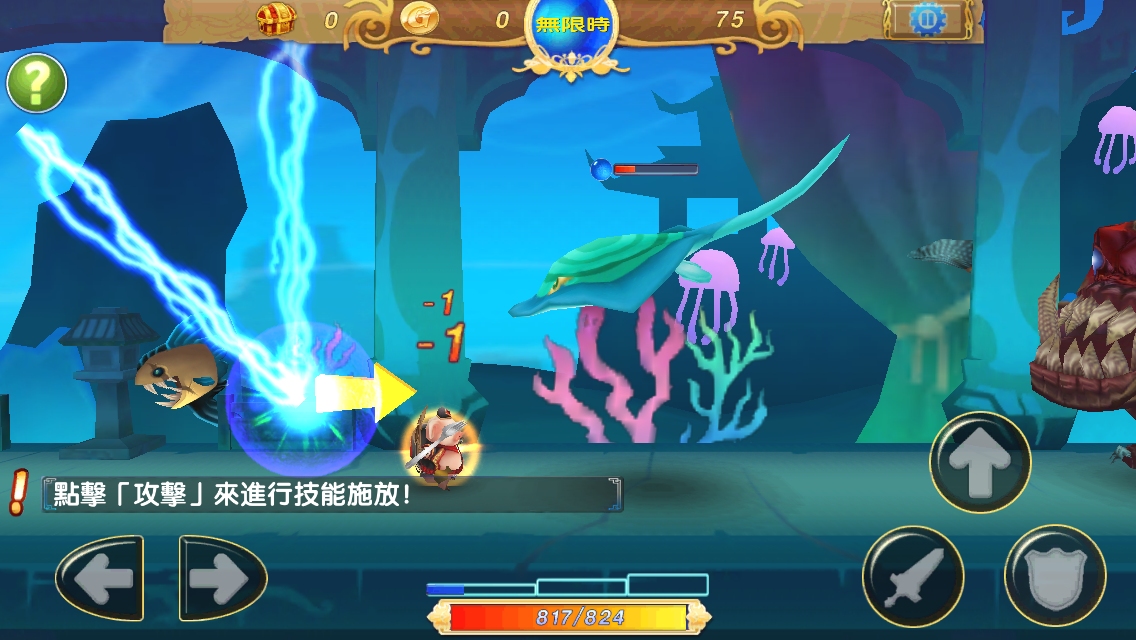 往前走,就會遇到第一個敵人 - 超級無敵大魟魚!不過不用擔心,只要不斷攻擊就可以取得勝利!