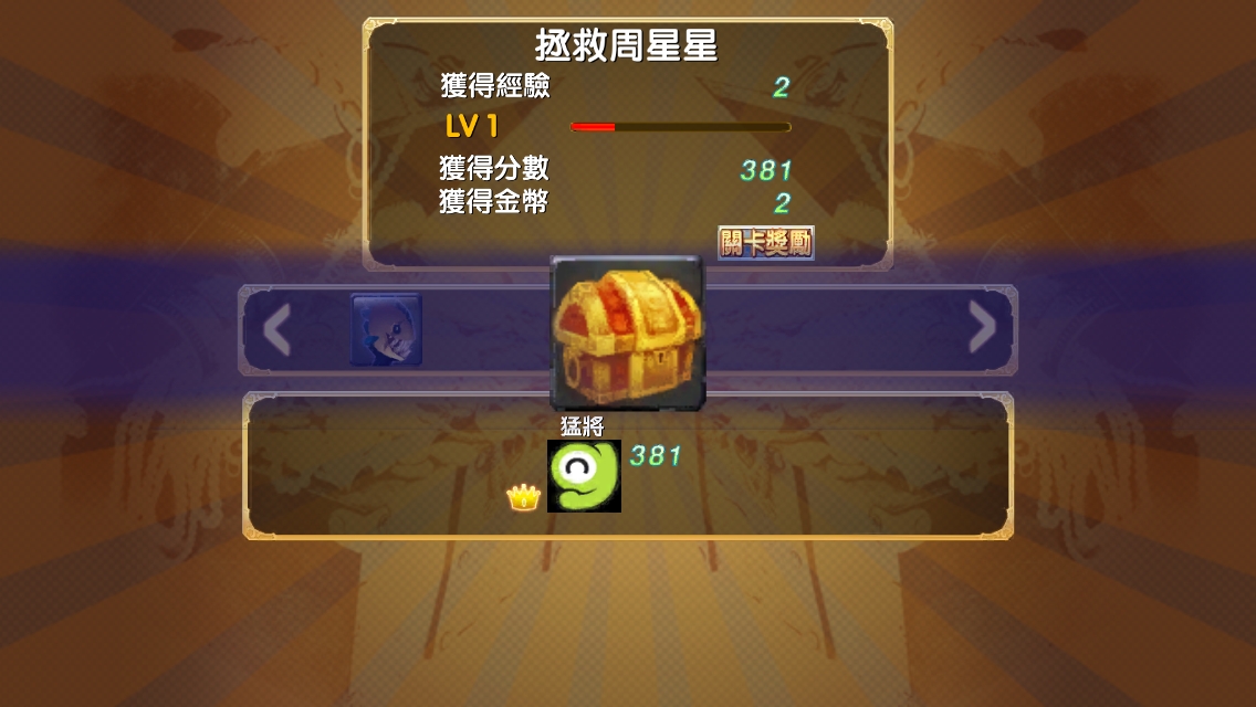 過關之後,進入關卡結算畫面,可以看到過關的分數、經驗值,以及獲取的獎勵。