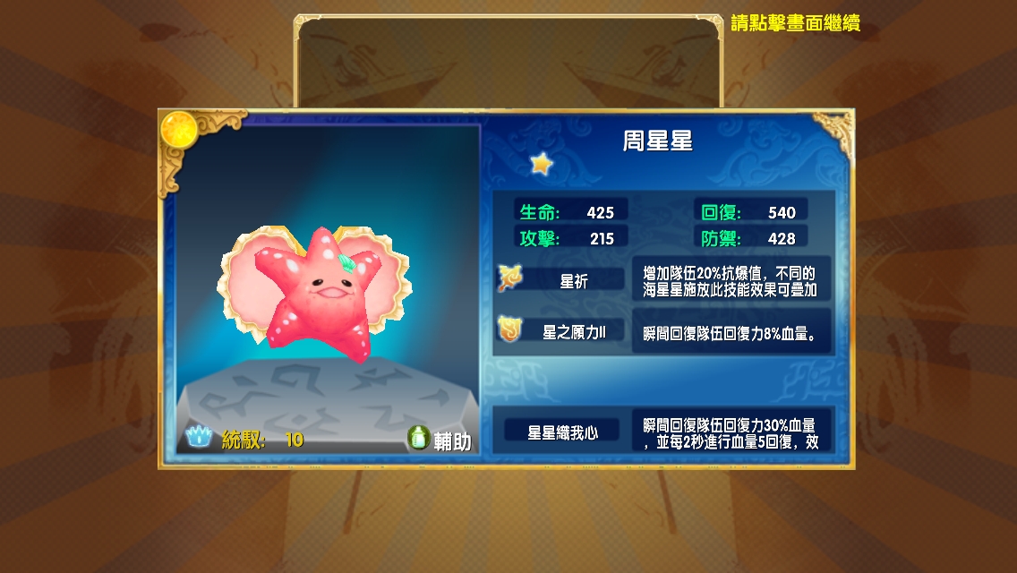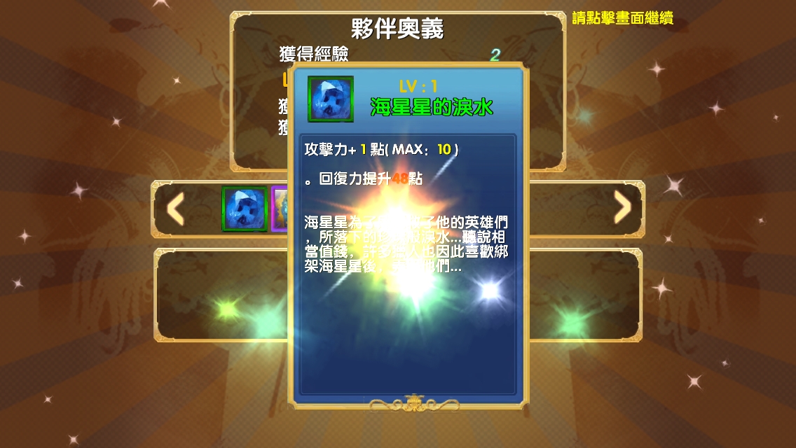 完成了寵物戰隊的編輯後,別忘了剛剛過關取得的裝備「海星星的淚水」!遊戲一樣很貼心的有簡易的裝備教學喔!