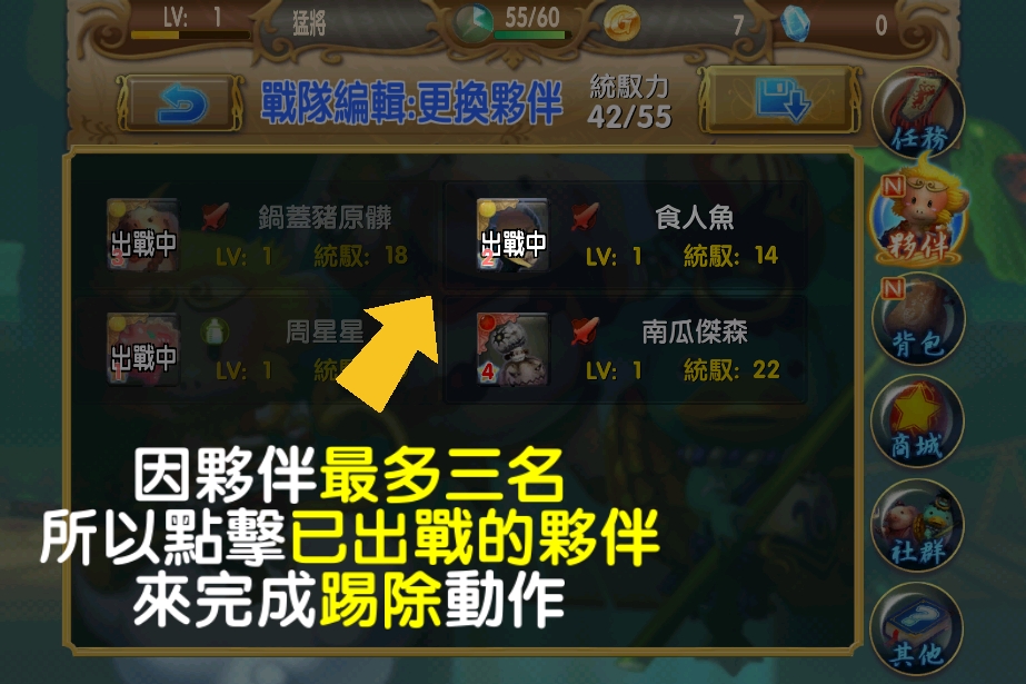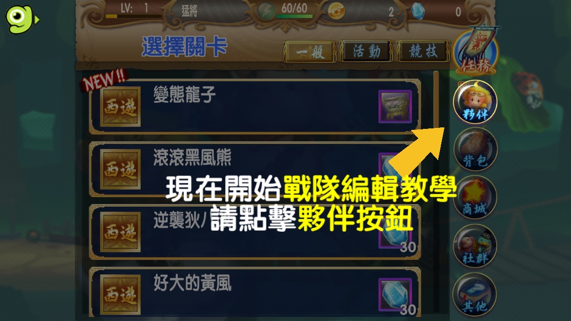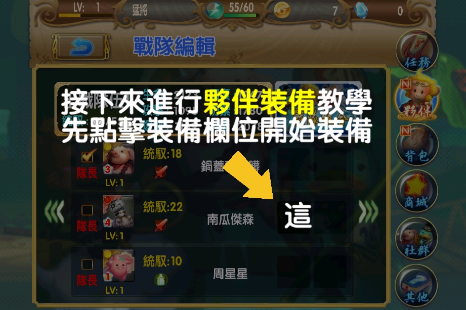 離開第一個新手關卡後回到主畫面,將會進行簡單的夥伴編輯教學,只要依照畫面的箭頭指示,跟著點擊,就可以成功編輯夥伴。畫面看起來相當簡單清楚,很容易上手。