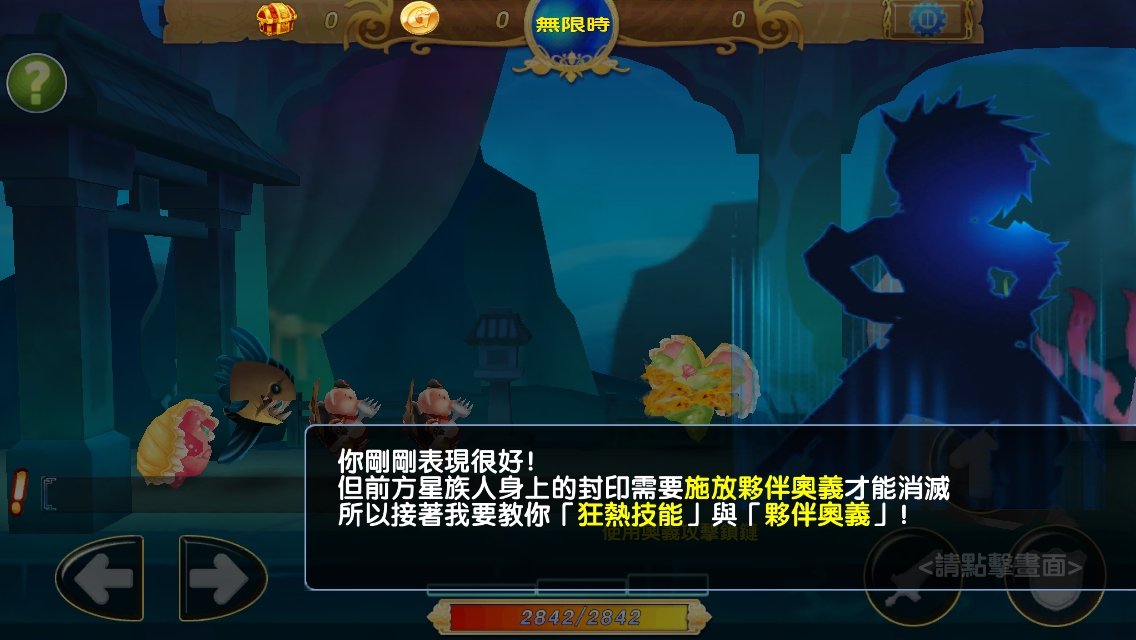 跟著戰隊編輯教學操作,緊接著下一個教學關卡 -「狂熱技能」與「夥伴奧義」,與剛剛的關卡教學一樣,有著簡單的劇情,以及清楚的操作教學影片和過關條件。