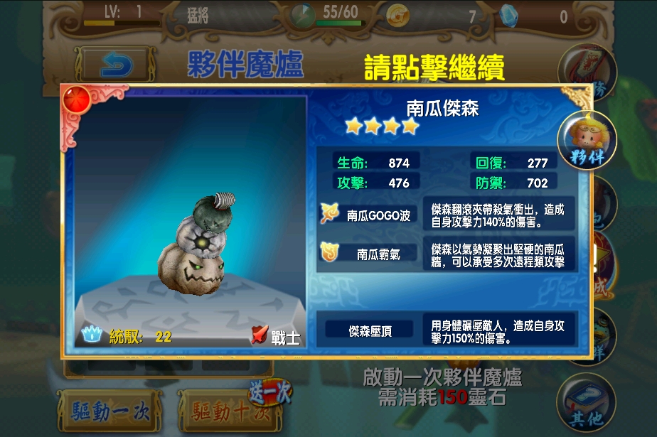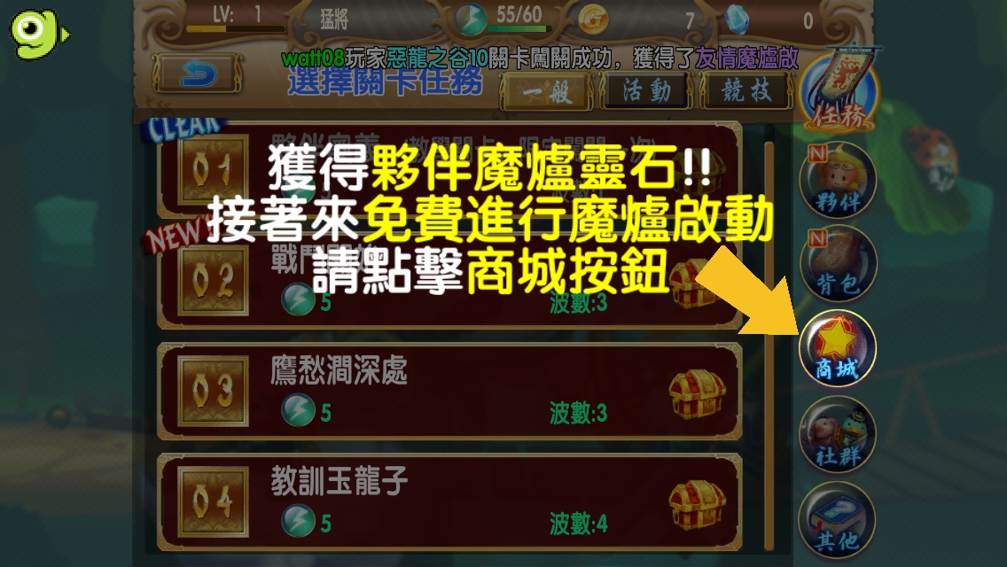 打敗 BOSS 就可以過關,過關後即可取得特殊裝備以及一個夥伴魔爐靈石。