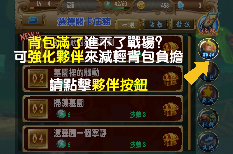 另外不得不多提的,就是「夥伴強化」、「裝備強化」和「競技場」。當玩家第一次素材背包滿的時候,將會進行夥伴強化的教學。因為素材背包滿時候,是進不了關卡的!