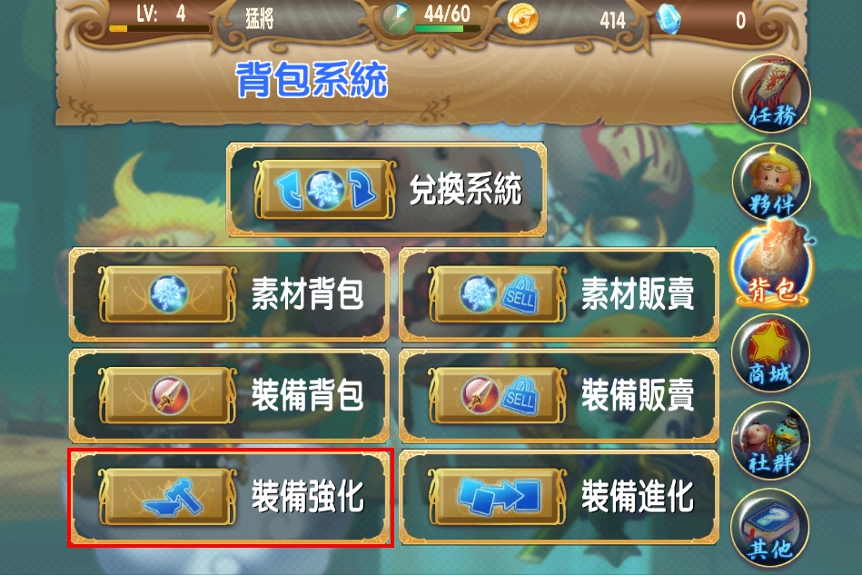 至於裝備強化的部份,玩家只要點擊主畫面右手邊的「背包」鈕,即可看到「裝備強化」鈕。點開就可以看到裝備強化頁面。