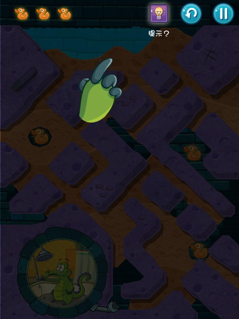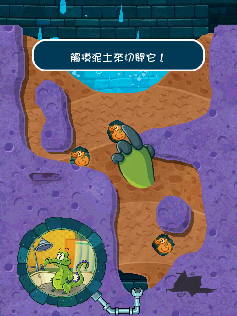 與前作相同,遊戲基礎的關卡目標與操作方式沒有改變。在畫面上方玩家將可看到一灘清水,下方則是困在浴室等待玩家幫助的小鱷魚主角。這裡我們要以手指觸控螢幕挖開土壤,只要能順利把水流引導入集水器內讓小鱷魚順利沖澡就算過關。