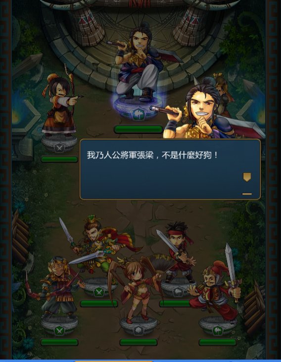 跳跳魏蜀吳》的關卡也值得一提,不僅還原了三國時代「黃巾之亂」、「討伐董卓」、「官渡之戰」等情景,而且與BOSS們的對白十分有趣,令人莞爾。比如挑戰張梁時,我方將領會說:「好狗不擋道!」然後張梁氣呼呼地回答:「我不是好狗……」筆者看到這句話時,正坐在捷運上玩遊戲,張梁的回答真的不知道有甚麼毛病,害我大笑出來在捷運上糗翻,這個遊戲真的可以再腦殘一點!