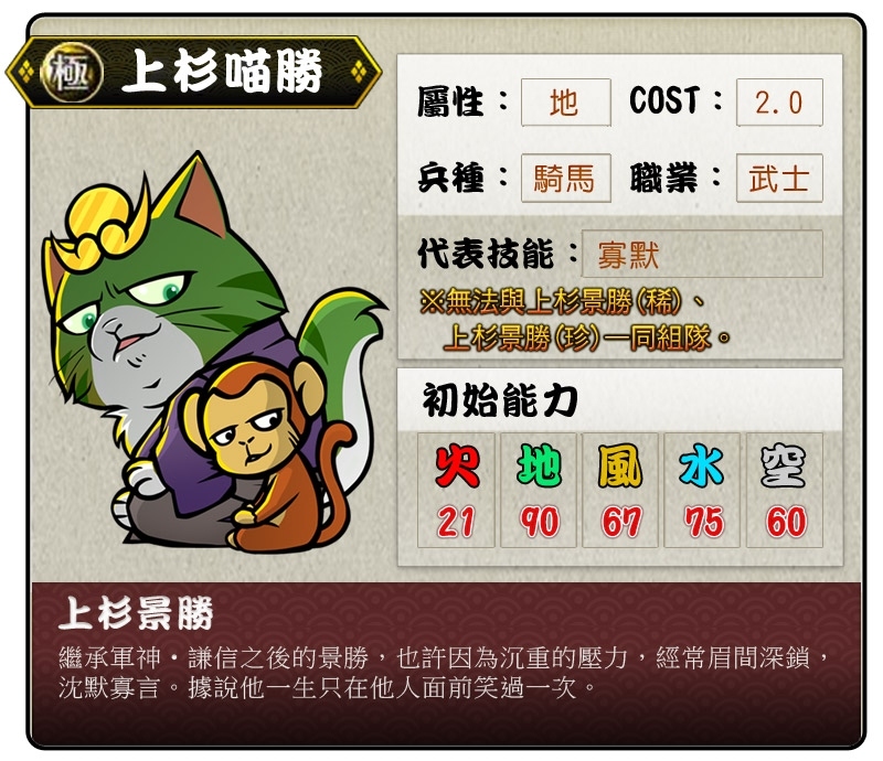 全新改版唯一極卡「上杉喵勝」幼名卯松、通稱「喜平次」,上杉景勝因成為軍神上杉謙信的後繼者而承受莫大的壓力不假言笑,曾因飼養的猴子滑稽的動作而只嶄露笑容一次故得「沉默的武將」之名!「上杉喵勝」其專屬技能「寡默」施展後,可提升我方全體的防禦力、德及策的數值!