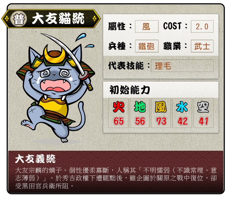 風屬性的「大友貓統」為大友宗麟之子,因其個性依柔寡斷而有「不明懦弱」之稱,雖企圖於關原之戰中取得秀吉信任,但遭黑田官兵衛的阻饒而功虧一簣!遊戲中其代表技能「理毛」可解除1種