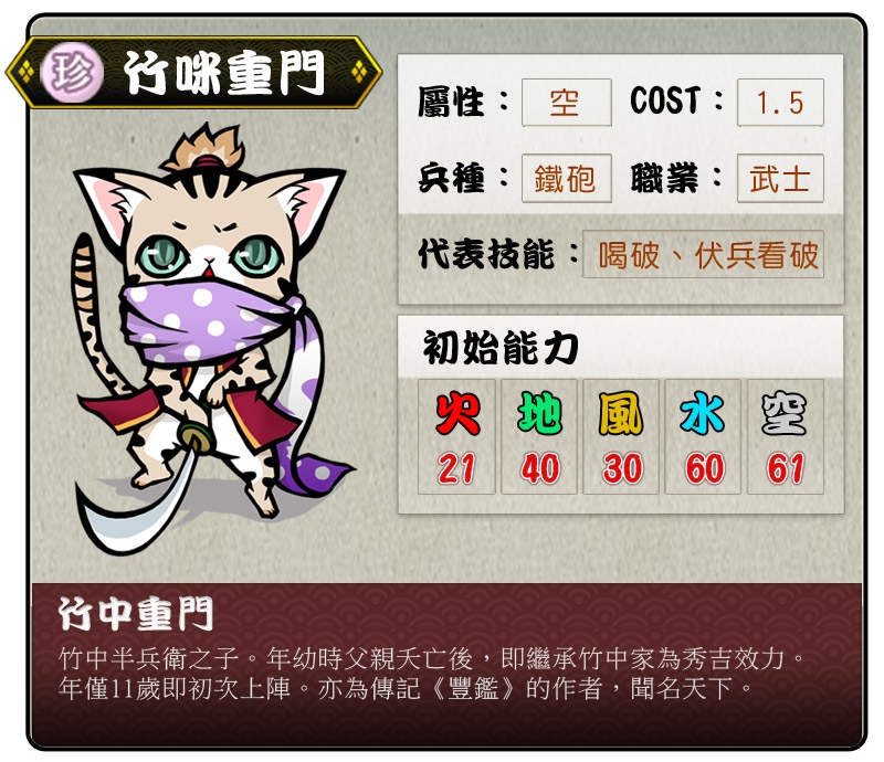 空屬性的「竹咪重門」為竹中半兵衛之子,不但11歲即代亡父出征外,更以撰寫日本《豐鑑》聞名天下!遊戲中其代表技能「喝破」可解除1種周圍敵人的屬性強化!