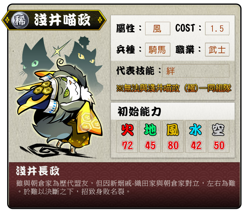 風屬性的「淺井喵政」傳說長相極為英俊且勇猛善戰,因歷代盟友朝倉家而與有姻親關係的織田家決裂,最後不敵織田大軍進攻而選擇自我了斷!遊戲中其代表技能「絆」可減輕發自遠距離敵貓的物理特技傷害!