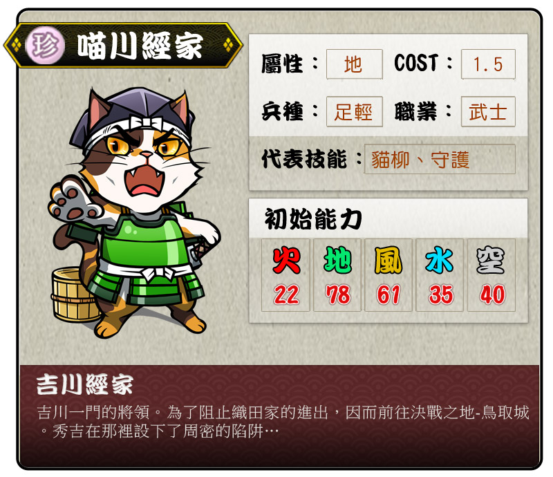 地屬性的「喵川經家」被毛利家選為擔任鳥取城主一職,後因豐臣秀吉的策略而讓鳥取城孤立無援,吉川經家以無傷兵的條件下選擇開城投降並自我了斷!遊戲中其代表技能「貓柳」可一定時間內吸引複數敵人的注意!