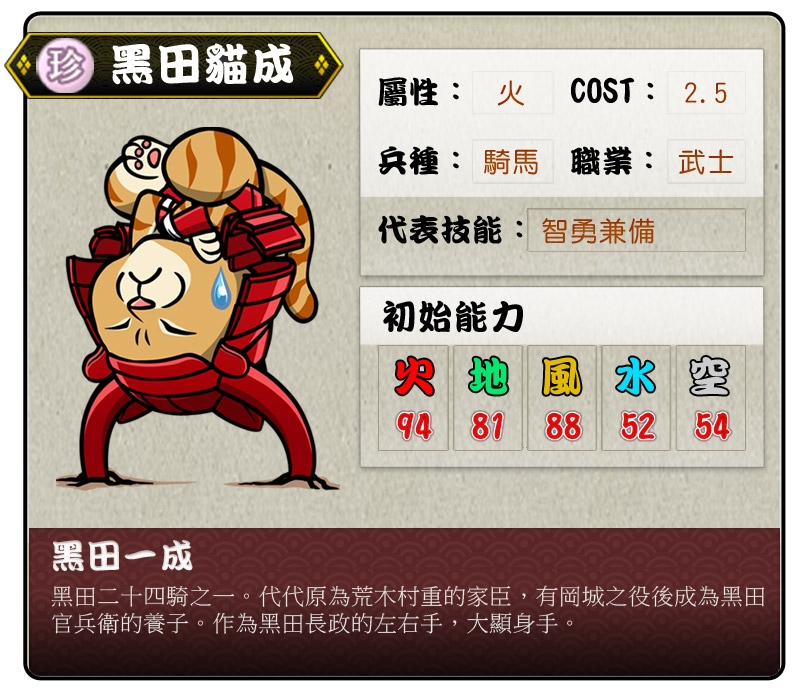 火屬性的「黑田貓成」原為荒木村重家臣,後在崗城之役後成為黑田官兵衛的養子並成為黑田二十四騎之一!遊戲中其擁有技能「投石」可攻擊敵方1人並使其有一定的機率混亂!