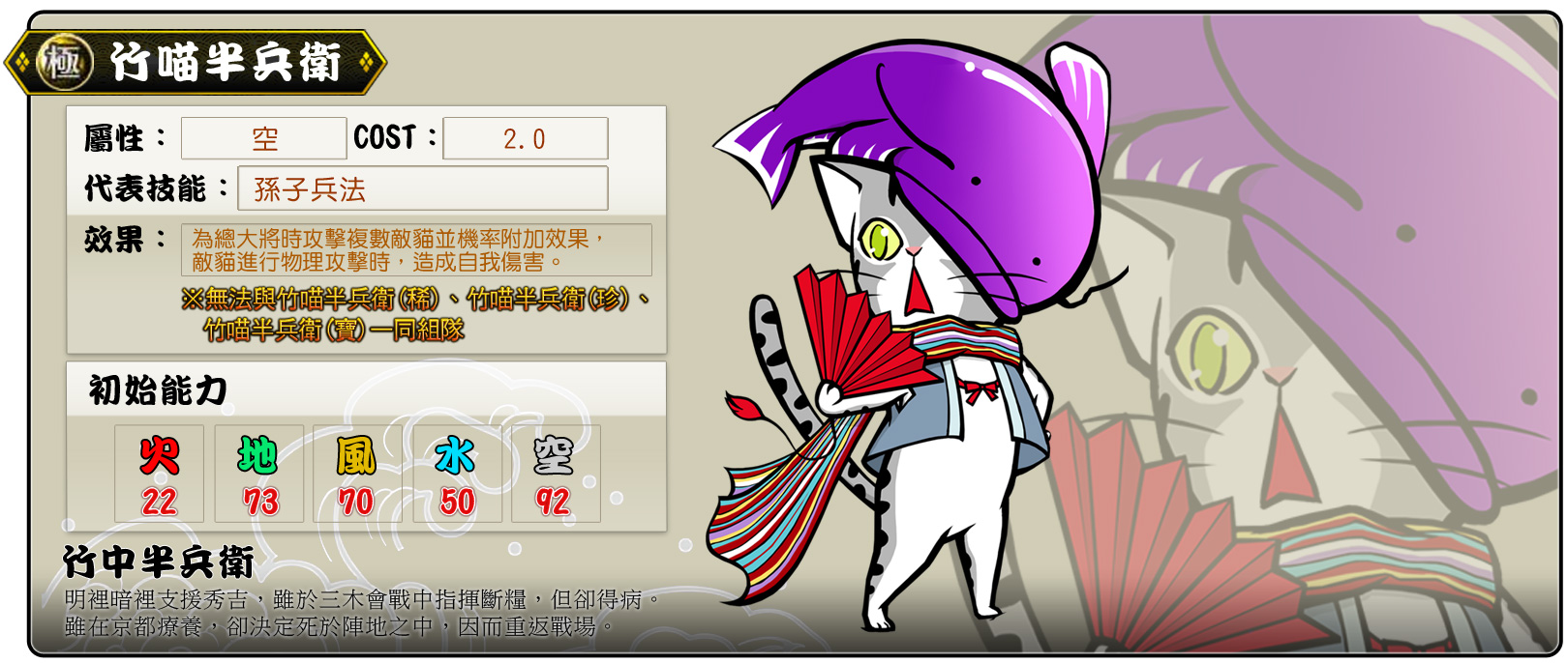 全新改版搶先日本推出的貓武將「竹喵半兵衛」原名竹中重治,通稱「半兵衛」,因曾差點取下織田信長的首級而獲得「美濃的麒麟兒」之稱,竹中半兵衛後效忠於豐臣秀吉麾下並因其優越的參謀能力在軍中享有極高聲譽!若遊戲中身為總大將,並發動代表技能「孫子兵法」除可攻擊複數敵貓外,還有一定機率發動附加效果使敵貓攻擊時反造成自我傷害!