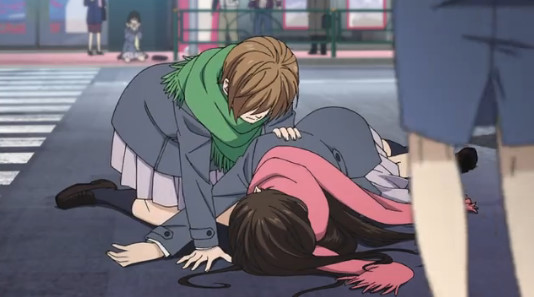 推開了差點被車撞上的夜斗,結果日向自己被車撞到了