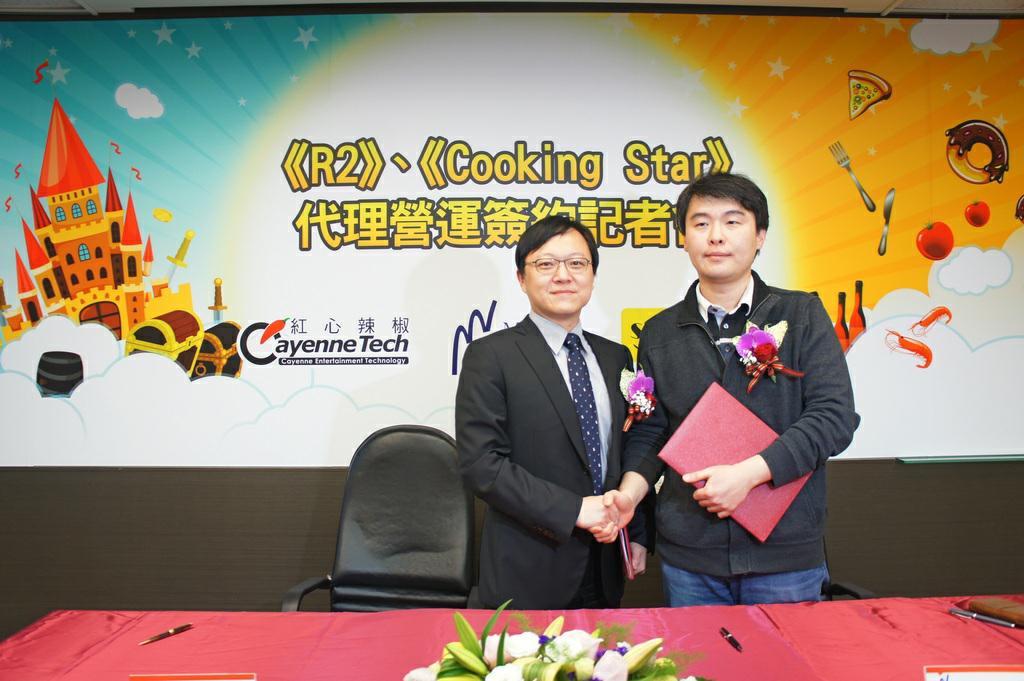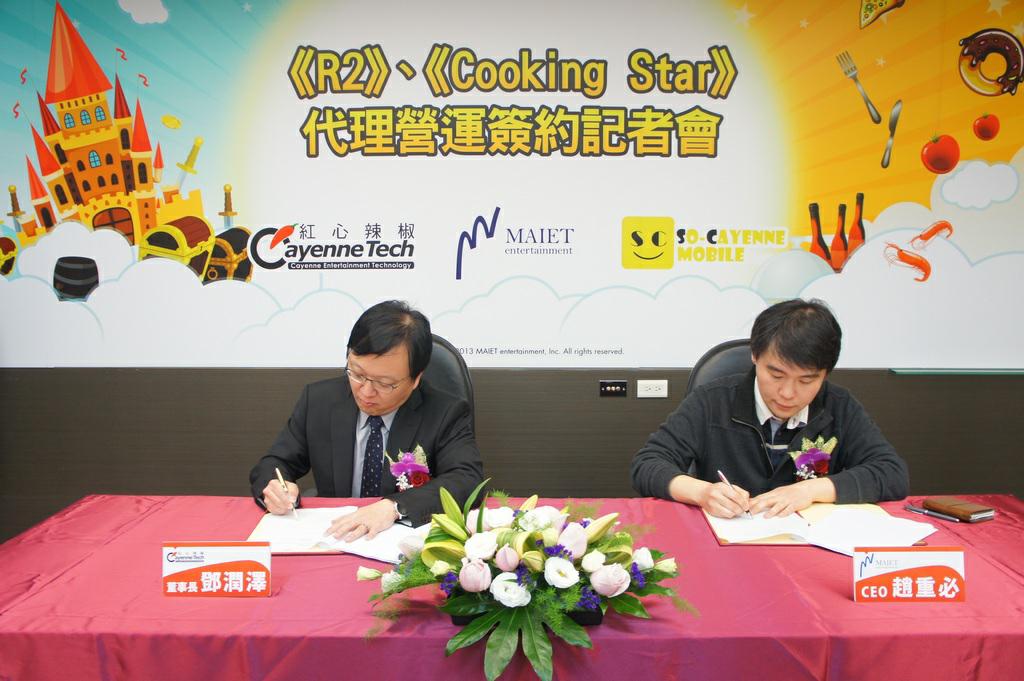 紅心辣椒集團董事長鄧潤澤和 MAIET CEO 趙重必簽訂手機遊戲《R2》及《Cooking Star》之代理營運權