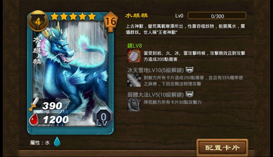 在遊戲之中,越高階的卡片發揮的戰鬥力越高,不過相對消耗的令牌數量也會增加,且高階牌組在抽到後的等待期間也較長,以五星級別的「水麒麟」為例,需要消耗 16 點的令牌數量,並且需要 4 回合的等待時間才可放置到戰場上。