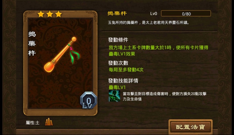 而由於遊戲之中的法寶都有特殊的發動條件,所以在選擇法寶時就要考慮自己牌組的組合方式以及敵人的屬性,如果自己的牌組屬性以火系戰鬥為主時,那麼需要土系卡片上場才能發動的法寶「搗藥杵」就不適合搭配使用。