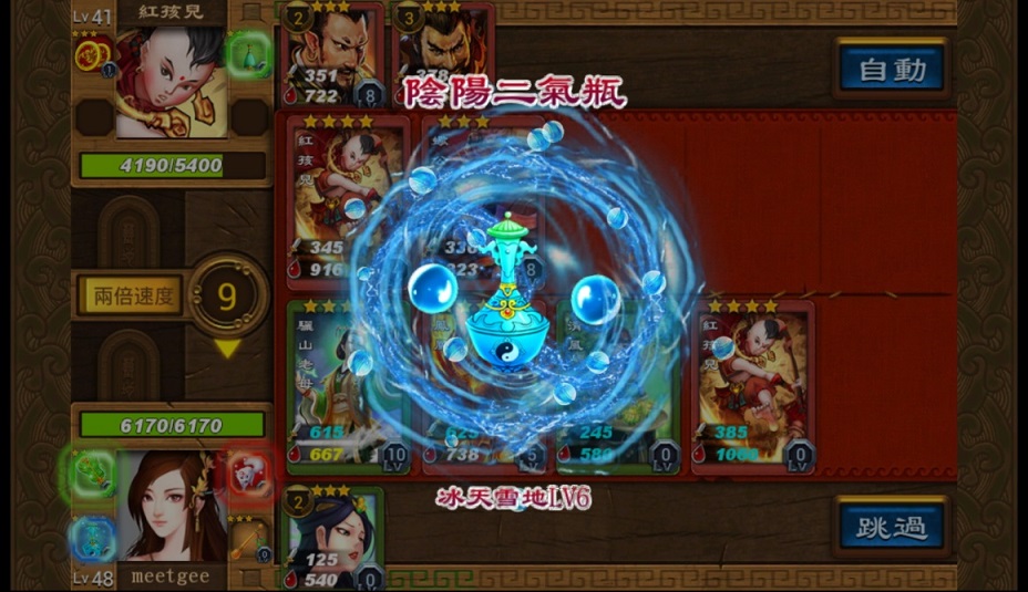 而如果敵方火系卡片多時,那麼需要敵方 2 張火系卡片在戰場上才能發動的高階法寶「陰陽二氣瓶」就可以壓制對方的卡片,使敵人受到大量傷害還有高機率麻痺無法進行攻擊,變成一面倒的戰局哦!