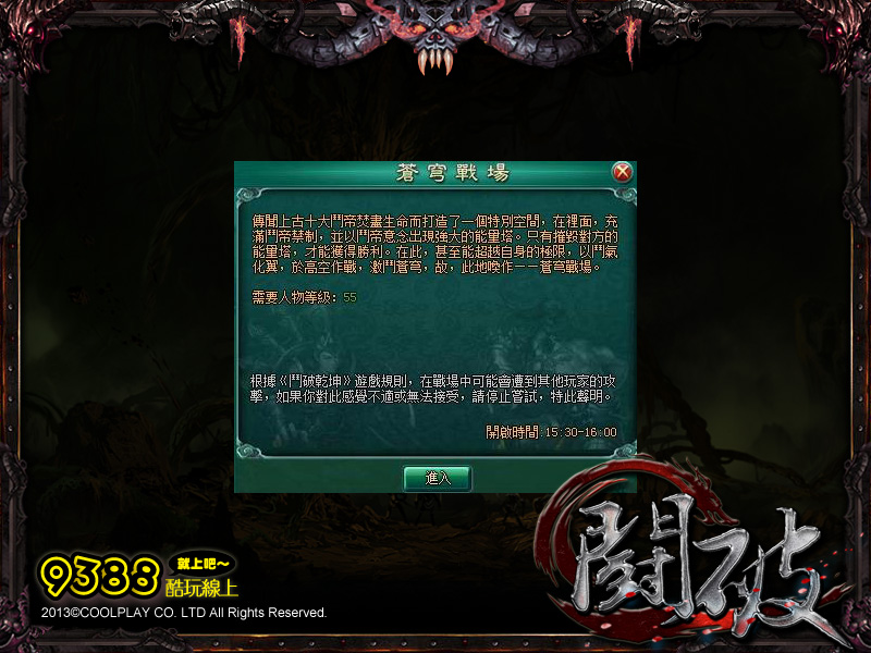 等級只要達LV55,皆可於每週二、四、六下午15:30~16:00,於遊戲介面點擊圖示進入戰場。緊接著系統將隨機把所有玩家分成兩個對立的陣營:蕭族、魂族。
