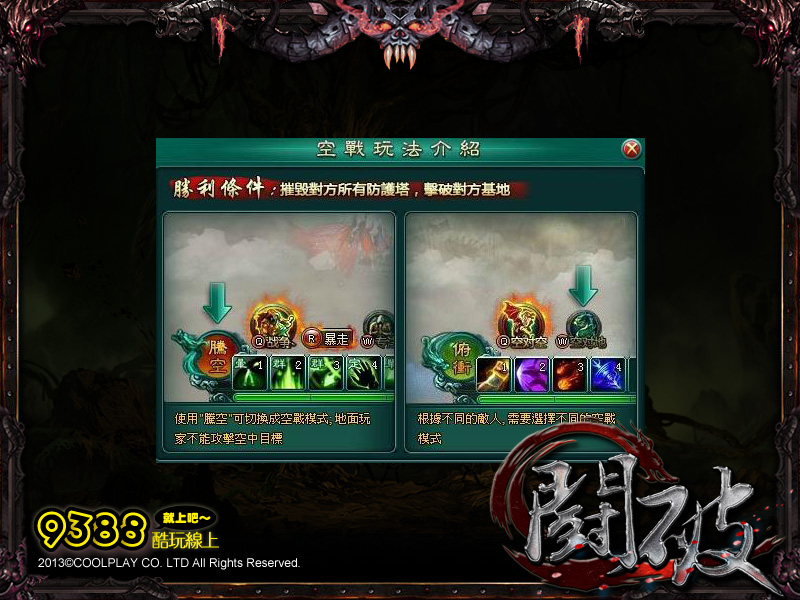 玩家可以透過頁面上點擊“騰空”技能或是按快速鍵“D”,即可鬥氣化翼,傲遊半空。騰空後,玩家可獲得更遼闊的視野,不僅能到達從地面無法到達的地方,還可獲得全新技能,包括“空對空”,“空對地”兩種戰鬥模式,玩家將根據不同位置的敵人,進行不同戰鬥模式的切換。不同模式的技能也將會有所不同。一旦騰空後,只要使用“俯衝”,即可解除空戰模式,降落到地面,並將鬥氣外泄,還可對周圍玩家造成眩暈和傷害。