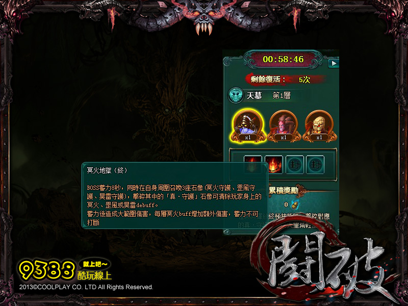 只要玩家等級達LV62,每日有兩次挑戰副本的機會。此副本共分3層,每一層有若干BOSS。玩家可以有對應的復活次數,復活次數一旦用完,將於死亡倒數後自動離開副本。以下官方整理出各層的玩法介紹:
