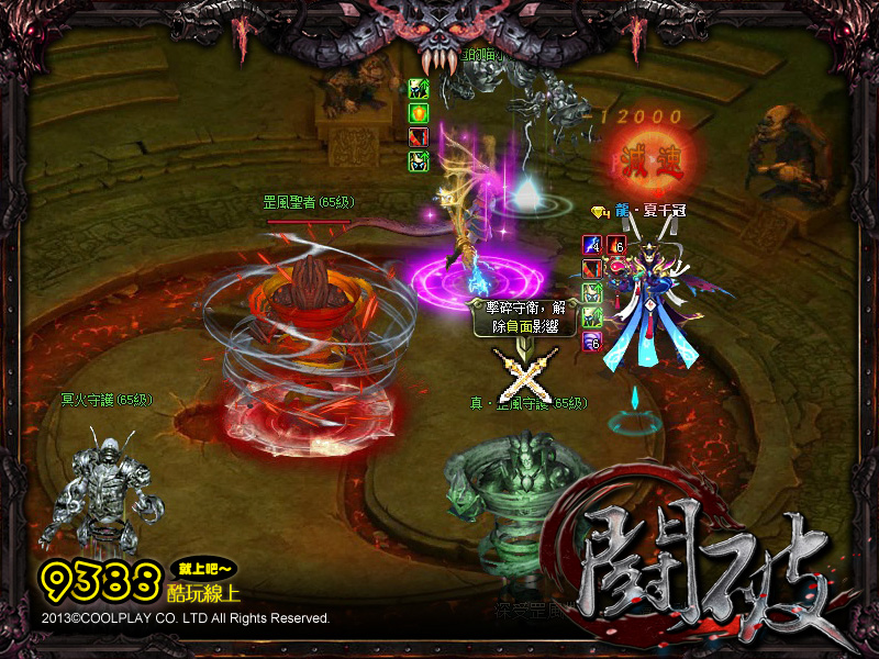 副本中,每隔一段時間BOSS周圍都會刷出4個冥火、罡風或者昊雷,3種單位觸碰到玩家後爆炸,給玩家附加上對應的負面狀態。每只BOSS都有一個終極技能,開啟終極技能時,BOSS需要先蓄力10秒鐘,此時在BOSS身邊刷出3尊守護石像(冥火守護、罡風守護、昊雷守護),擊碎石像可解除身上對應的負面狀態。