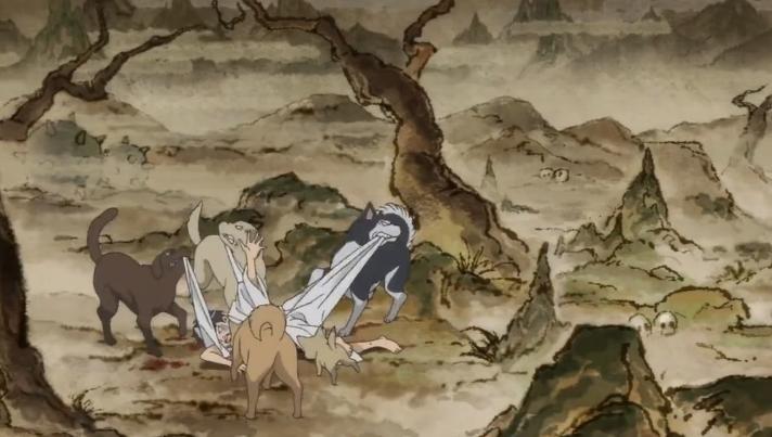 構圖用色配合地獄主題因此稍嫌暗了一些,但也色彩豐富,原作漫畫中畫風本就特別有意無意的保留一點日本浮世繪的風格,而在這點,動畫中則採了個折衷的形式,在背景構圖大量用上日本傳統山水風情,看著動畫人物站立其中倒也頗為契合。