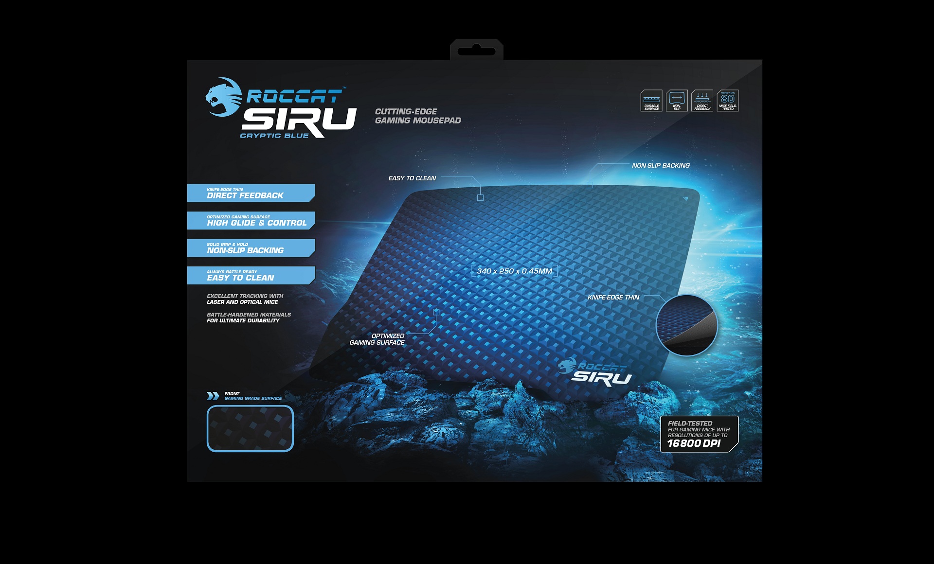 Siru 滑鼠墊專為速度特別研發。滑鼠在滑動時完全不會受到阻礙,因此能輕鬆、準確地追蹤敵人動向。除了優異的滑動特性外,創新的 Siru 滑鼠墊亦具備精準控制能力,可避免瞄準不足或過度瞄準的情況。此滑鼠墊提供魅影藍和深邃黑兩種時尚且搶眼的顏色,並且經過 80 種以上雷射和光學式滑鼠的實際測試。.