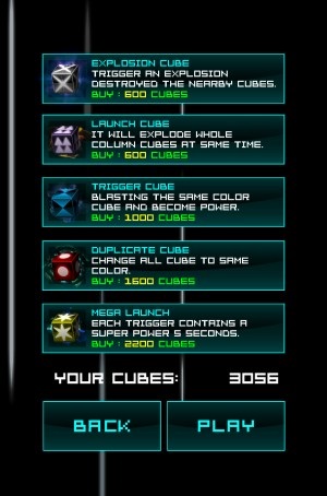而第二個模式就是可在短時間內遊玩的「一分鐘模式(1 MINUTE)」。在這個模式一開始,玩家可利用在遊戲中所賺取的 CUBES 來購買會在這局遊戲中出現的有利特殊方塊,只要點擊道具再點 PLAY 就可開始遊玩,如不想使用道具的話就直接點擊 PLAY 即可。