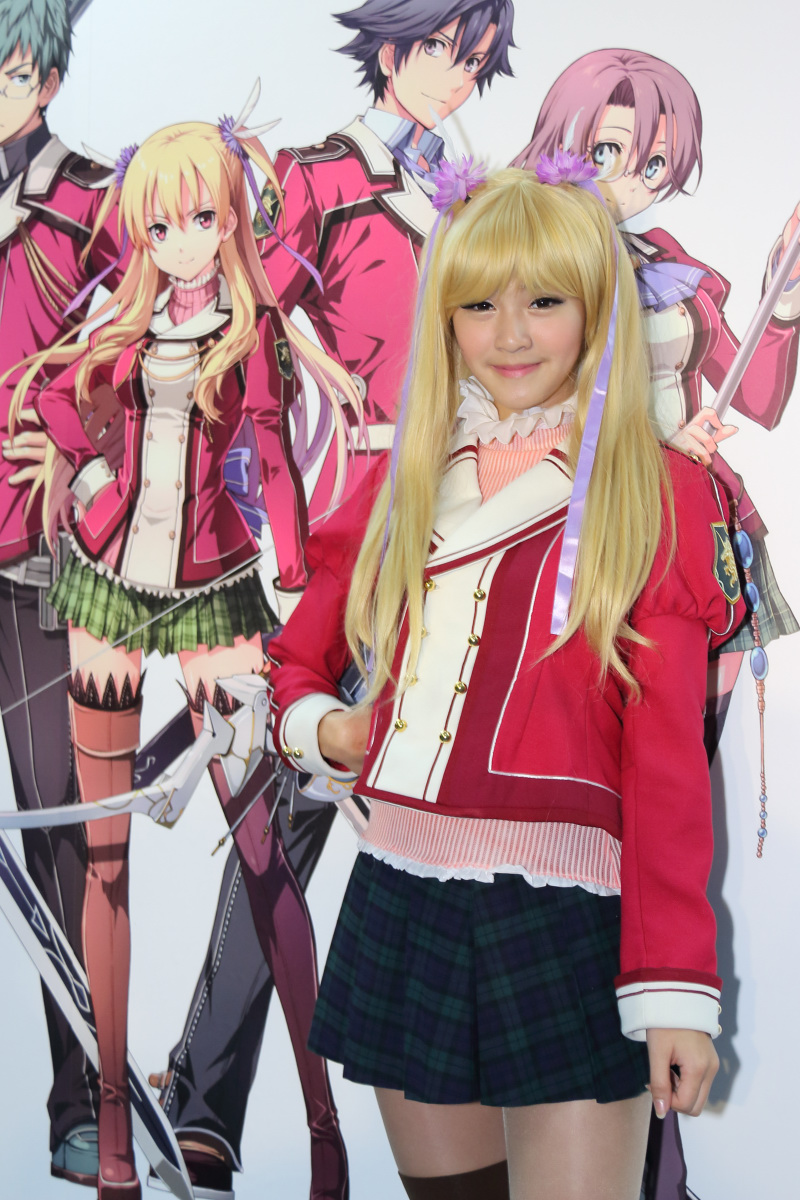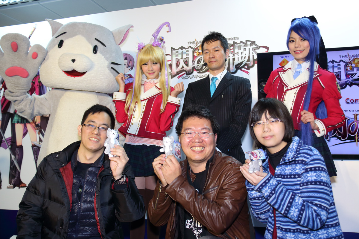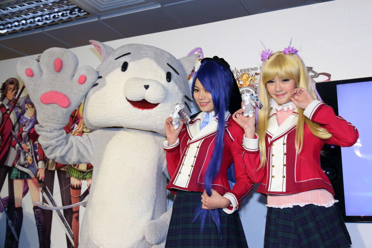 軌跡》系列吉祥物咪西以及扮演成遊戲角色亞莉莎與勞拉的甜美 Show Girl 讓與會玩家拍照,緊接著請到本次發表會的主角-日本 FALCOM 社長近藤季洋。