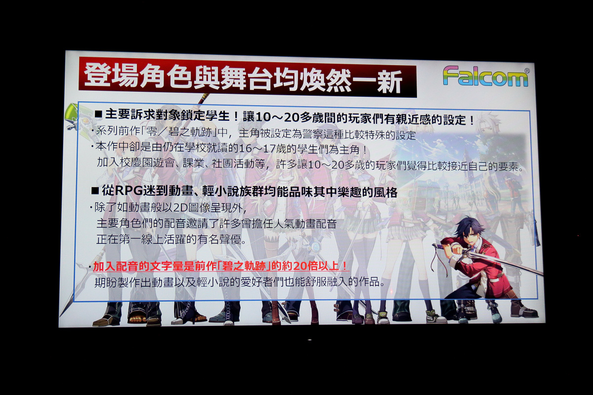 英雄傳說 閃之軌跡》的介紹。這款接續《空》、《零》、《碧》之後的新系列首部作品,承襲《軌跡》系列世界觀並收錄煥然一新的舞台與角色,以 16~17 歲學生為主角的校園風設定,ACG 族群廣泛接受的 2D 動畫風格以及前作 20 倍以上的知名聲優配音。收錄多達 65 名全新設計的主要角色與上百名配角,另外《