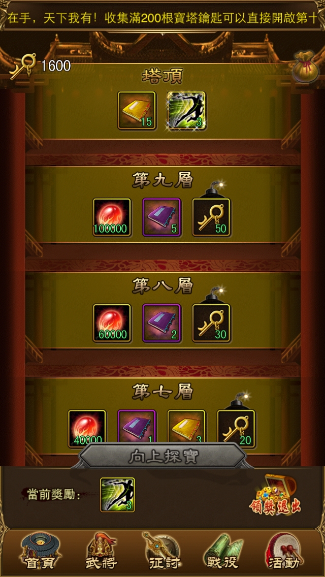 2 月 7 日當天累計儲值 2 萬元寶或以上,免費贈送華佗×1、高級統帥×2、技能經驗書(1000 點)×3、將魂 2 萬。