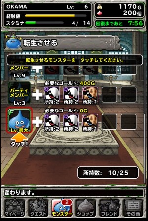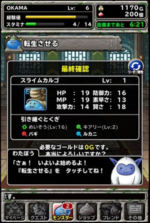 「轉生」則是需要魔物蛋才可進行,不過魔物蛋上所擁有的技能可繼承到轉生後的魔物身上,所以當發現魔物蛋的時候就會不知道有沒有想要的技能以及會不會加入的期待感。不過由於轉生是無法重複進行的,所以要技能哪個技能也要慎重選擇。