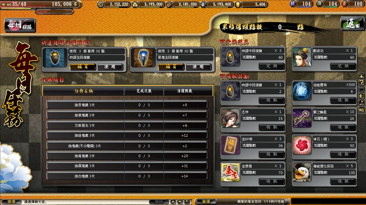 1 月 28 日更新後,全新系統「每日任務」正式上線。玩家可在每日任務視窗內看到相關任務,只要完成即可獲得「活躍點數」,使用活動點數即可兌換夢幻逸品的道具,其中包含了武將卡與小判道具。而「活躍點數」可兌換的獎勵將會不定期更新,看中喜歡的武將或道具可別錯過了。為了陪玩家度過歡喜的農曆新年,《
