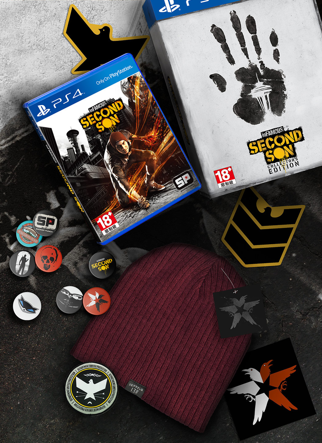 PS4 同梱包(14480 元)共 3 種。預約特典為遊戲中可供主角穿著的 4 件「原創設計夾克」。首批特典是講述前作主角柯爾壯烈犧牲之後到本作開始之前這段期間所發生故事的額外章節「柯爾的傳奇」,過關可獲得「柯爾的夾克」,另外還有「傳奇背心」DLC。