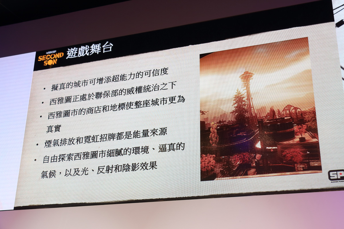 提問的部分,首先是被問到為什麼這次會選擇真實的城市西雅圖為舞台,肯‧施蘭姆笑著說因為 Sucker Punch Productions 就在那邊(貝爾優市與西雅圖市分別位於華盛頓湖東西兩側),取材比較方便,所以成為首要選擇。遊戲中重現了太空針塔(Space Needle)等西雅圖知名地標,有去過的玩家應該會很有感覺。製作團隊以西雅圖為傲,希望將西雅圖的風光透過遊戲傳達給玩家。