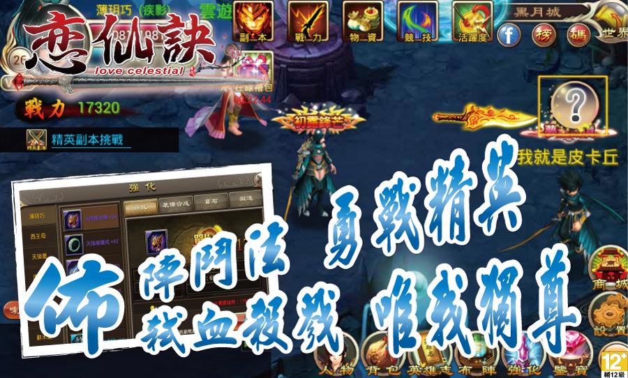 戀仙訣》擁有許多方式來提升戰力,讓你的角色可以更順利進級後面關卡;隨著召募的英雄越來越多,就需要配合各英雄的特色來布陣發揮各特色,並同時可以將陣法升級來提升戰力;在裝備強化方面,玩家可透過【鍛造】、【強化】、【合成】、【寶石鑲崁】等多方面的提升來提高戰力,裝備升級每次需要消耗一定數量的材料,一般來自於【副本掉落】;當實力達到一定的程度後,要提升自已的戰力就可以考慮來挑戰闖天關或精英副本,來獲得更豐富的收穫。