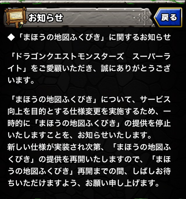 SQUARE ENIX 於 2 月 5 日晚間對外發表公告,表示旗下 iOS/Android 手機遊戲《勇者鬥惡龍 怪獸仙境 SUPER LIGHT》(開發、營運為 Cygames)為了優化服務而需要實施系統變更,因此暫時停止遊戲中「魔法地圖抽籤(まほうの地図ふくびき)」的功能。當系統維護完成後,抽籤系統即會再度開啟。
